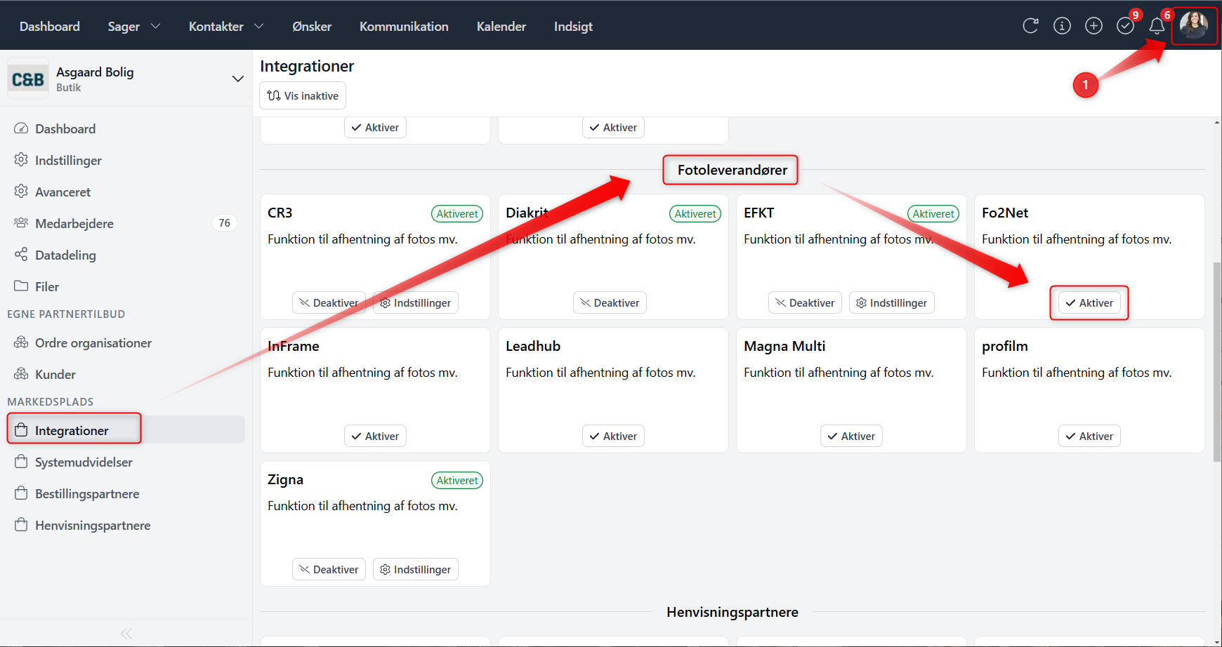 Nu kan du indhente billeder direkte fra din fotoleverandør i Mægleruniverset! Du skal først lige sørge for at "aktivere" din fotoleverandør under "Forretningsenhed" -> Markedsplads, "integrationer" -> rul ned til "fotoleverandør" og vælg din leverandør. Klik på "Aktiver" og indsæt adgangsoplysninger du tidligere har indsat i C&B Classic.