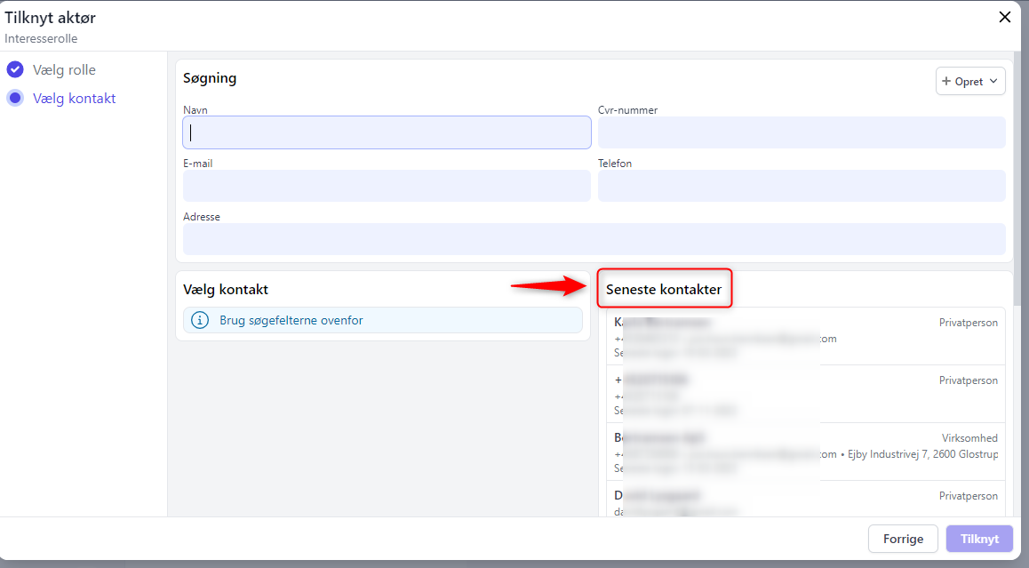 Når du vælger en kontakt via en fremsøgning vil denne samtidig blive registreret i overblikket over "seneste kontakter". Det gør det nemmere at vælge den samme kontakt, når du fx booker en aftale med vedkommende og efterfølgende vil registrerer på en sags interesseliste.