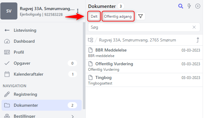 Det giver dig et nemt overblik, så du hurtigt kan se hvilke dokumenter du har delt med fx en sælger, køber mv. samt hvilke dokumenter du har delt offentligt. Offentlig adgang er de dokumenter du har tilgængelig på din hjemmeside, eller som kunden fx får adgang til i sit Kundeunivers, hvis de favoritmarkerer ejendommen.