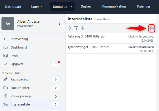 Det er nu muligt ved at trykke på "plusset" og vælge den ejendom, som din kunde skal have ind på sin interesseliste.