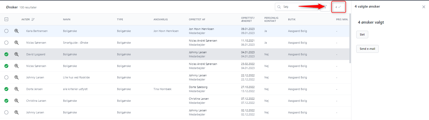 Det er muligt fra Ønsker i globalmenuen, at sende en mail ud til alle kunder, som har et aktivt ønske i butikken. Derudover også muligt at slette flere ønsker samtidig ved en eventuelt oprydning af butikkens opskrevne ønsker.