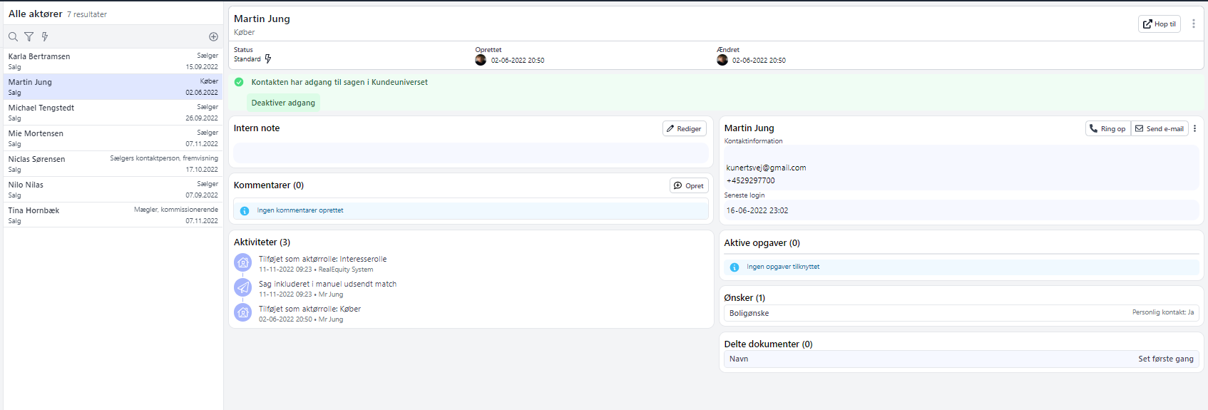 Når du trykker på din "aktør" eller "kontakt" på Sagen eller dens interesseliste, vil du nu få et fuldt detaljeret overblik over den valgte aktør/kontakt.