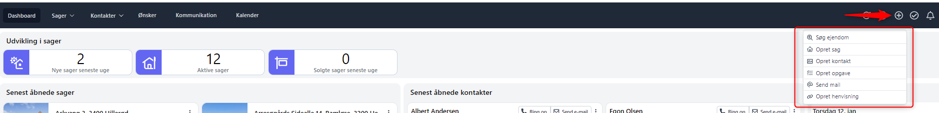 Når du via Globalmenuen trykker på enten; Sager, Kontakter eller Ønsker, vil du automatisk "lande" i søgefeltet, og dermed påbegynde din søgning med det samme.