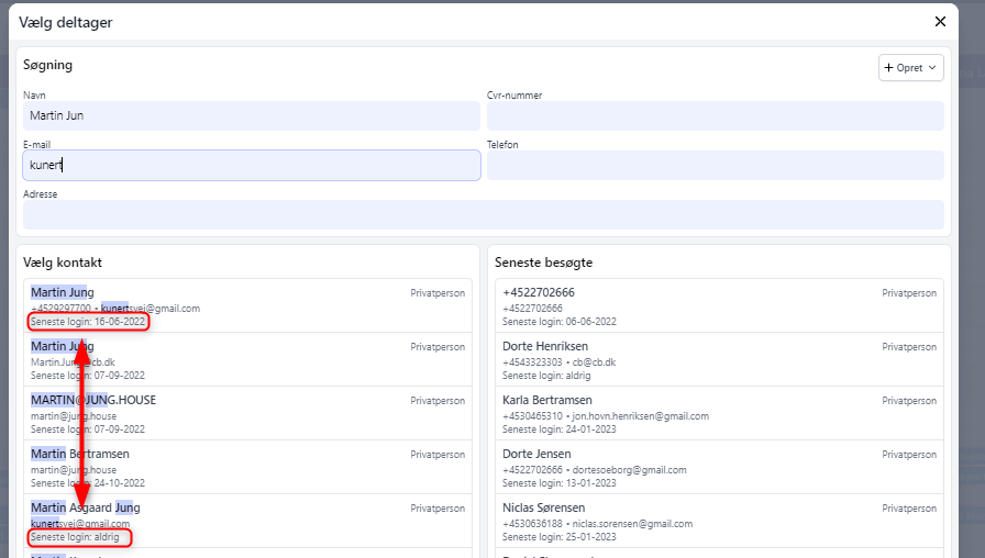 Det vil derfor være mest korrekt, at vælge den "kontakt" med "seneste login", når du netop skal tilføje vedkommende til en aftale, opgave mv.
