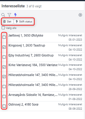 Du kan nu nemt vælger flere af sagerne på din kundes interesseliste, og derefter skifte status eller slette.