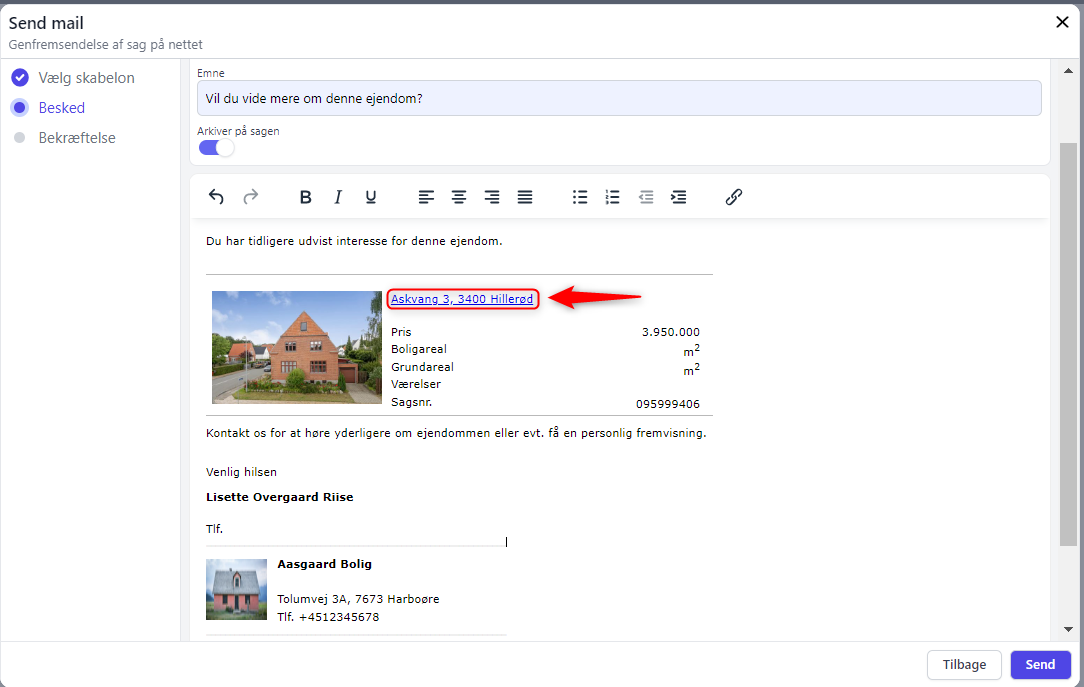 Hvis ejendommen er officielt til salg og annonceret, vil der i mailen være link direkte til ejendomspræsentationen på din hjemmeside.