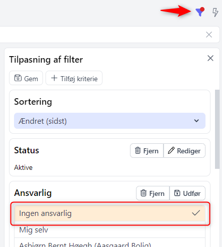 Du kan nu også danne dig et lynhurtigt overblik, ved at benytte den nye filtreringsmulighed; "ingen ansvarlig", når du opretter nyt filter.