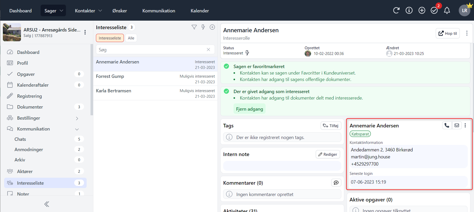 Sidst men ikke mindst, vil du nu kunne se på din sags interesseliste, om dine kunder er købsparate eller ej - og om det er dem du først skal give et kald, når ejendommen fx sættes ned i pris!