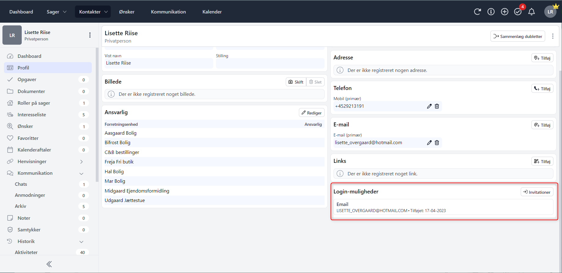 Du kan nu via kundens profilside se, hvilke login-muligheder din kunde har benyttet. Trykker du dig videre ind på "invitationer", kan du ligeledes få et overblik over, hvilke invitationer der er sendt afsted til din kunde - og om de eventuelt har nogle liggende, som endnu ikke er accepteret.
