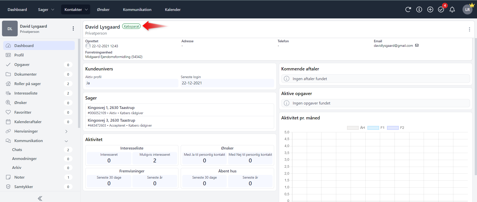 Nu følger "tagget" din kunde som beskrevet ovenfor, og kan derfor nu også ses på din kontakts dashboard: