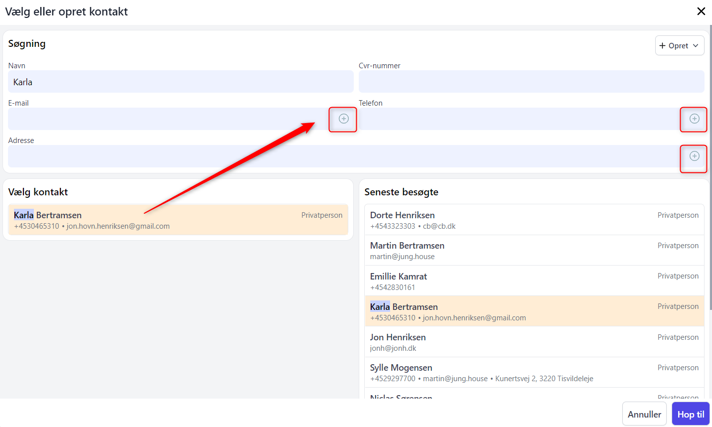 Hvis din kunde fremgår af listen nedenunder, er det nu muligt at markere kunden og berige den eksisterende kontakt.